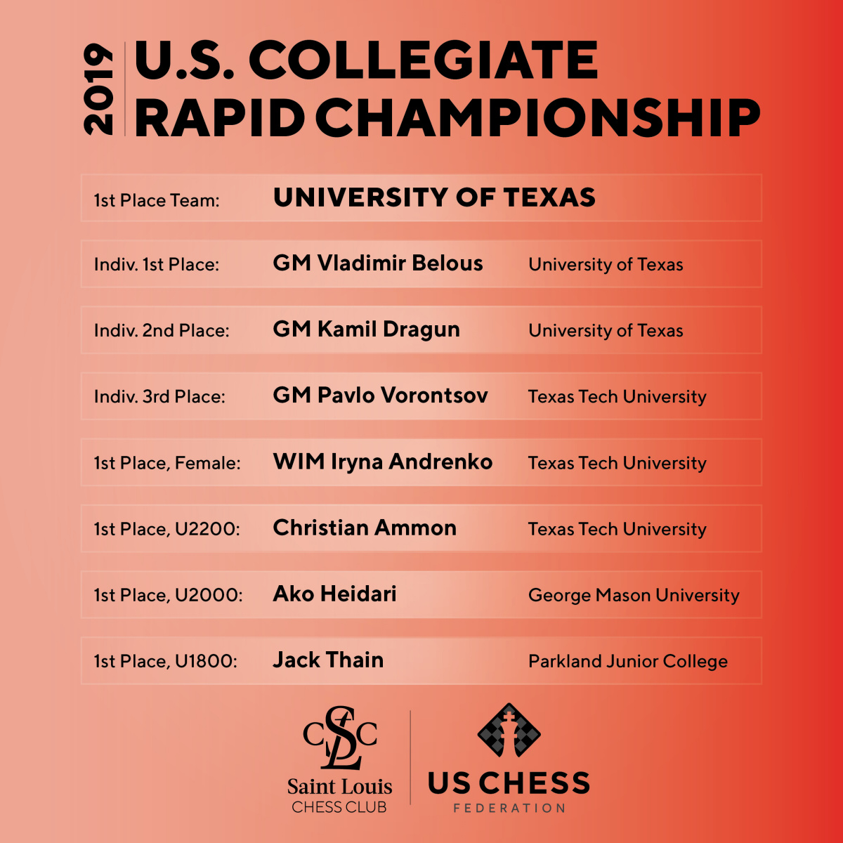 At the end of competition, the 2019 U.S. Collegiate Rapid Champion 2019 U.S. Women’s Collegiate Rapid Champion 2019 U.S. Collegiate Blitz Champion, and2019 U.S. Women’s Collegiate Blitz Champion will be decided. The event will determine invididual winners, as well as two teams: 2019 U.S. Collegiate Rapid Champions (team) and 2019 U.S. Collegiate Blitz Champions (team).