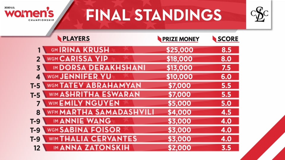 The 2020 U.S. Women’s Championship is an elite national championship event, featuring 12 of the strongest female chess players in America. Over the course of eleven rounds, these competitors will battle for $100,000 in prize money and the title of 2020 U.S. Women’s Chess Champion.